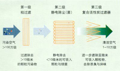 2、主要是通过静电使得尘埃颗粒带上电子降落,清除粉尘有效,但杀菌效果一般;